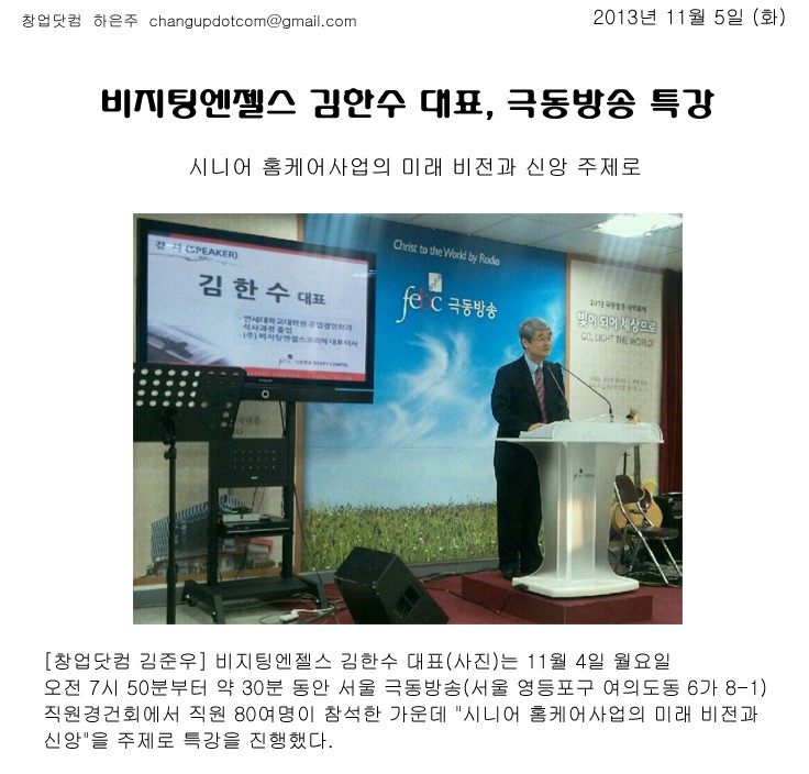 VA소식 미디어 지점 활동 및 소식 채용 채용 신청서 제목김한수 대표이사, 극동방송 특강2019-12-30 14:46작성자비지팅엔젤스 코리아 Information 목록 댓글 [0] 더보기이전제2회시니어 플래너 페스티벌 (건국대)비지팅엔젤스 코리아 Information2019-12-30다음김한수 대표이사 사단법인 서울기업경제인협회 감사에 임명비지팅엔젤스 코리아 Information2019-12-30 Powered by MangBoard | 망보드 스토어