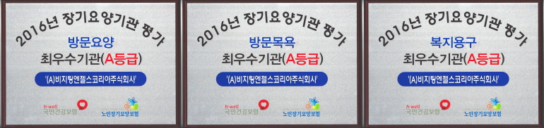 비지팅엔젤스코리아는 2010년부터 2년마다 실시된 재가 장기요양 기관평가에서 전국 최초로 4회 모두 A등급 (최우수기관)으로 선정되었고,전국에 있는 4개 지점(구로지사, 강서지점, 천안지사, 천안동남지점) 이 방문요양과 방문목욕, 복지용구 부문에서 A등급으로 선정되는 성적을 거둬, "국내 노인장기요양 서비스 제공 기관 중 수위 기업" 임을 입증하였습니다. (2017-04-28) |