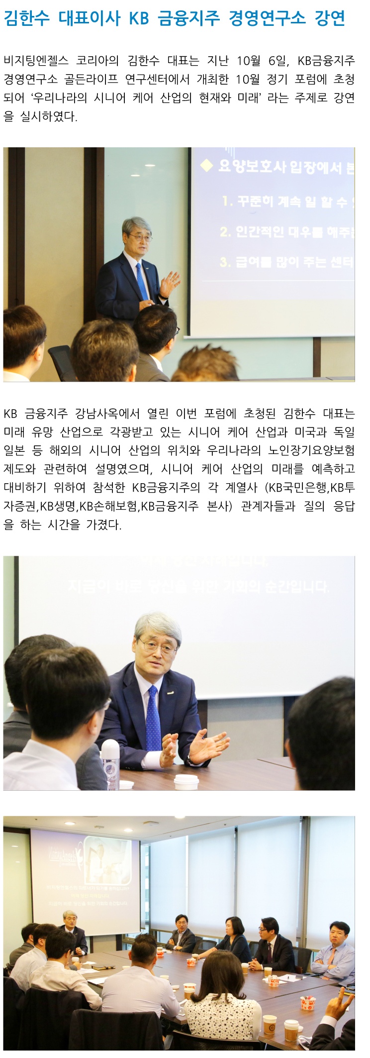 VA소식 미디어 지점 활동 및 소식 채용 채용 신청서 제목김한수 대표이사 KB금융지주 경영연구소 강연2019-12-28 20:29작성자비지팅엔젤스 코리아 Information 목록 댓글 [0] 더보기이전신임 사무관 교육생, 비지팅엔젤스에서 '민간기업 체험교육' 연수비지팅엔젤스 코리아 Information2019-12-28다음부산대학교와 산학협력 MOU 협의비지팅엔젤스 코리아 Information2019-12-28 Powered by MangBoard | 망보드 스토어