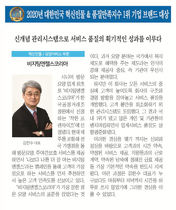 비지팅엔젤스코리아가 2020년 대한민국 혁신인물 & 품질만족지수 1위 기업 브랜드 대상에서 요양서비스 부문을 수상 하였습니다.