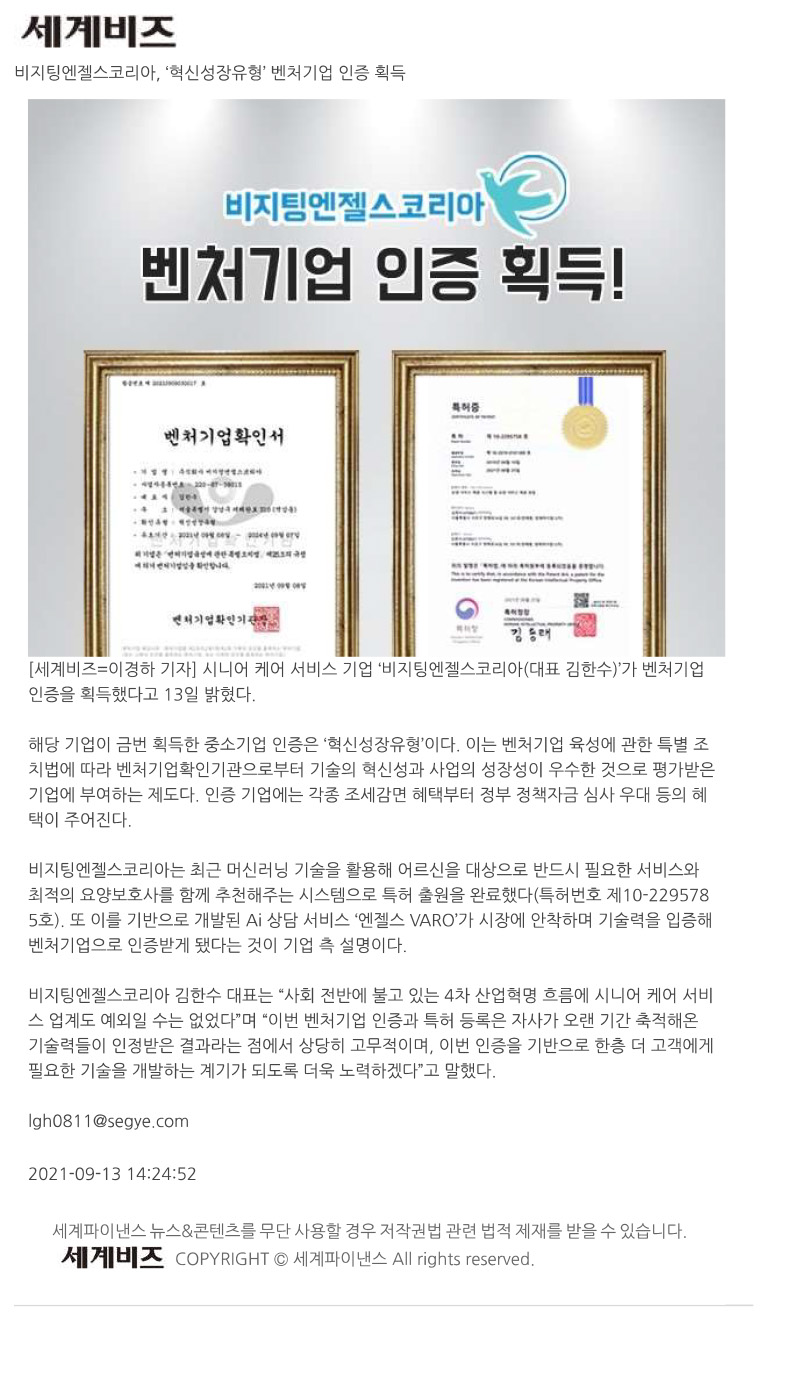 VA소식 미디어 지점 활동 및 소식 채용 채용 신청서 제목비지팅엔젤스코리아, '혁신성장유형' 벤처기업 인증 획득2021-09-16 14:33작성자비지팅엔젤스 코리아 Information 목록 댓글 [0] 더보기이전비지팅엔젤스코리아, 어르신 케어 추천 서비스 특허 취득비지팅엔젤스 코리아 Information2021-09-16다음서울경제인협회와 MOU 체결비지팅엔젤스 코리아 Information2021-09-10 Powered by MangBoard | 망보드 스토어